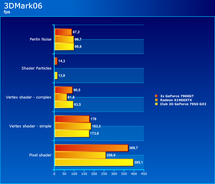 La versione 06 dello stesso test è più incentrato su nuovi tipi di shader più complessi, nuovi effetti luminosi, ombre più realistiche, maggiore carico poligonale. In questo caso la tecnologia Ati non riesce a competere con il maggior fill-rate delle schede di nVidia (il vantaggio della 7950 GX2 è in media del 55% con SM 2.0, mentre del 30% con SM3.0). Questo test premia evidentemente la maggiore frequenza del core rispetto a quella delle memorie, per cui la GX2 è sempre davanti alla coppia di 7900GT in SLI (siamo sul 4%).