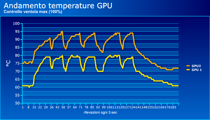 A questo punto abbiamo spinto le ventole al massimo (senza aspettare che lo facesse il driver quando le GPU raggiungevano le soglie limite da lui impostate):