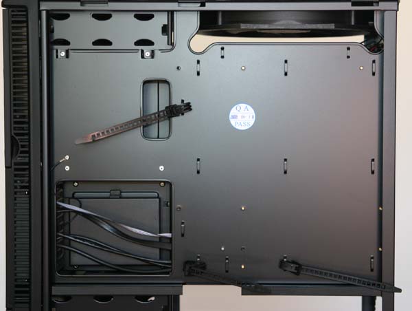 Sul lato opposto del pannello sul quale viene fissata la scheda madre, sono state ricavate delle feritoie e delle asole. Tramite questi accorgimenti è possibile far passare in questa zona la maggior parte dei cavi di alimentazione e di comunicazione. Ad assemblaggio ultimato ci troveremo così ad avere l'interno del case completamente libero dai soliti grovigli di fili ai quali siamo purtroppo abituati, ed al contempo eviteremo che i cavi ostruiscano, anche se parzialmente, il passaggio d'aria generato dalle ventole.