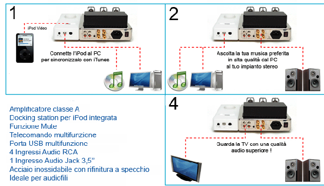 Lupus RePure è compatibile con qualsiasi modello di iPod, anche i più recenti ed è utilizzabile anche come amplificatore per l’uscita audio del vostro PC o del vostro lettore DVD/DivX grazie alla presenza di connettori standard audio RCA.