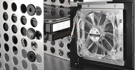 La gabbia per hard disk modulare supporta fino a sei unità da 3.5". L'alimentatore è montato verticalmente utilizzando una piastra posteriore che offre la possibilità di utilizzare la ventola dell'alimentatore stesso per aspirare l'aria calda proveniente dall'interno del PC diminuendo così rumorosità.